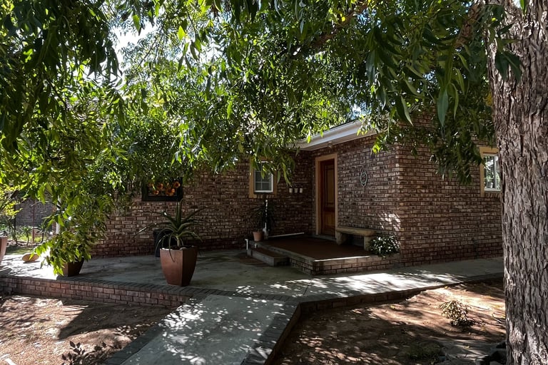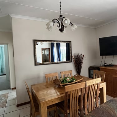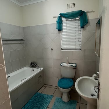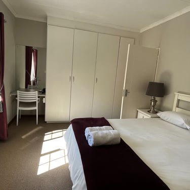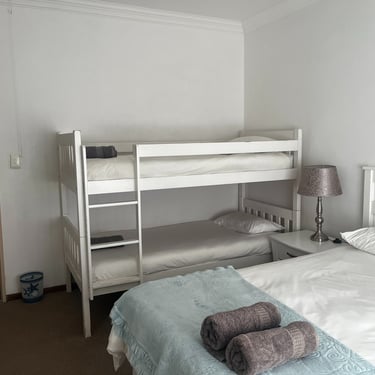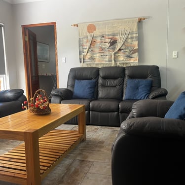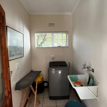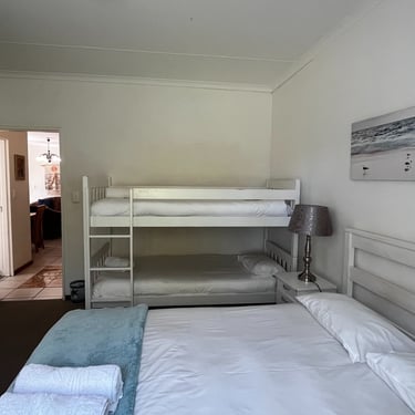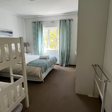 The villa is located on the ground floor comprises 2 bedrooms and 2 bathrooms. The first bedroom is furnished with a queen-size bed and has an en-suite bathroom with a shower, toilet, and basin. The second bedroom is furnished with a queen-size bed and a bunk bed. The second bathroom is fitted with a bath, toilet, and basin. The living area is open-plan and leads to a veranda. The kitchen contains a fridge-freezer, a microwave, 4-plate stove, an oven, crockery, and cutlery as well as a breakfast nook. The lounge has comfortable couches and a 32-inch flat-screen TV with selected DStv channels. There is a dining table for 6, a laundry room with a washing machine, and ironing facilities. The units offer comfortable outside furniture and portable braai facilities.
